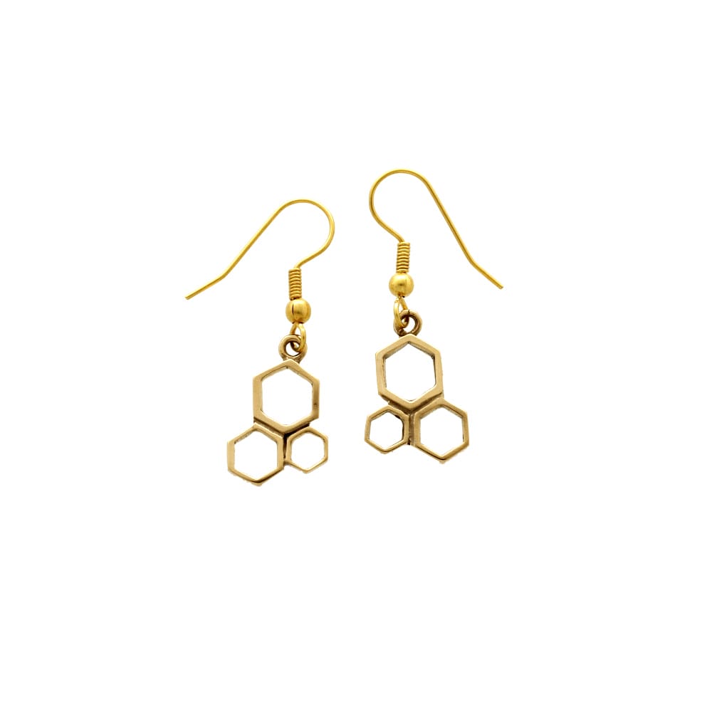 Bronze honeycomb drop earrings – bronze earrings with three different sized hexagons to give the effect of honeycomb, make a lovely companion to the bronze bee pendant. Come on gold-plated ear wires.