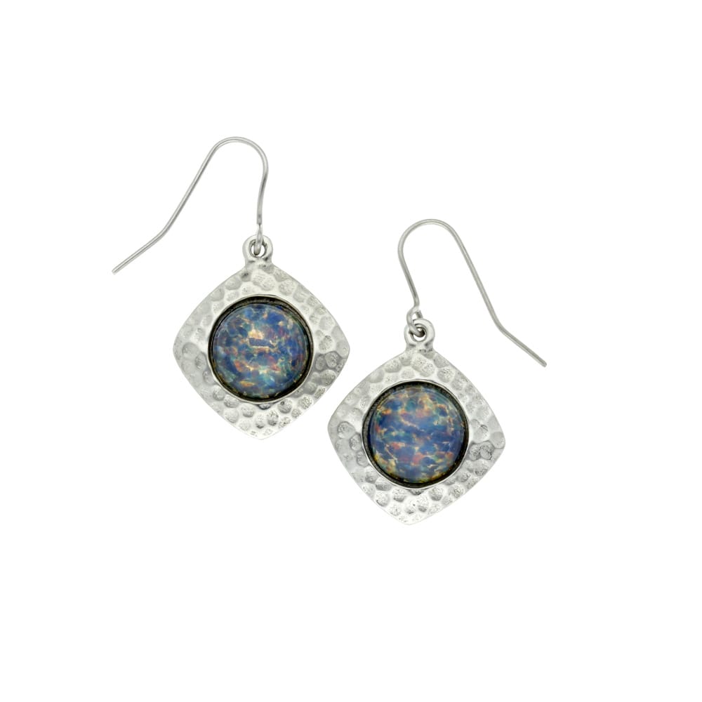 Hammered opalised square drop earrings – hammered pewter square earrings with opalised glass stone centres on surgical steel hook.