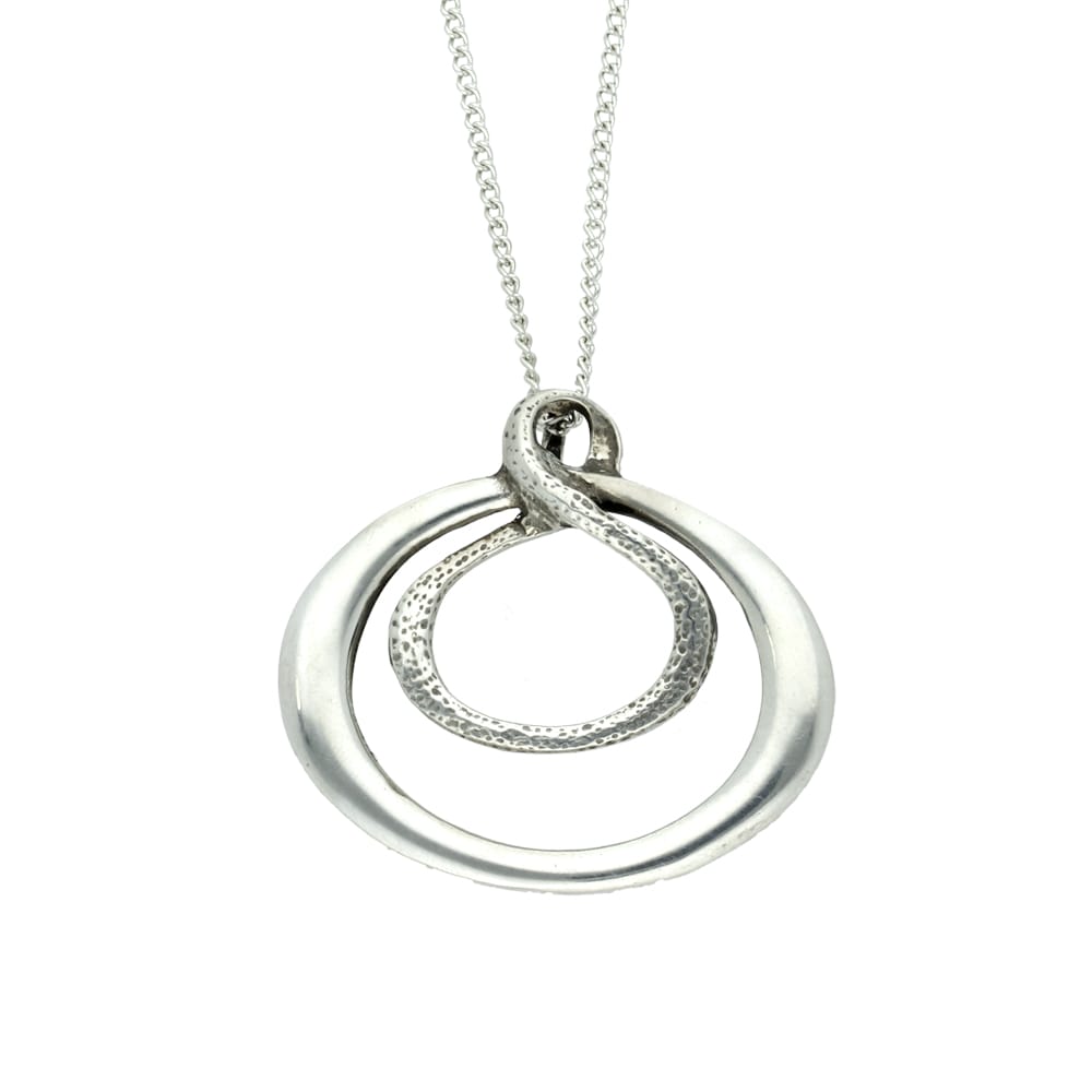 Large double loop pendant – pewter pendant with two entwined loops on a long 27″ chain, designed to be worn over clothing.