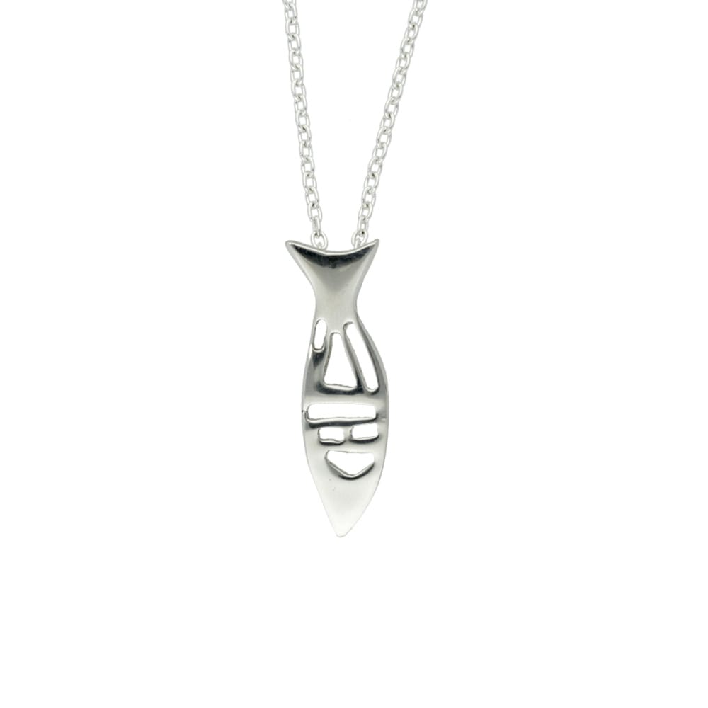 Pierced fish pendant – Highly polished pewter openwork fish pendant on an 18″ tin-plated trace chain.