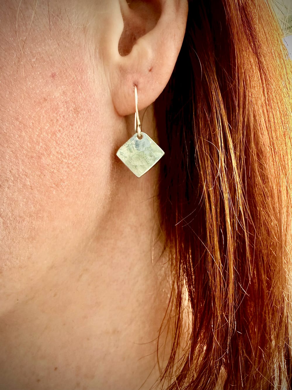 Small hammered square drop earrings – highly polished pewter square earrings with a hammered finish to catch the light. Hang on surgical steel ear wires.